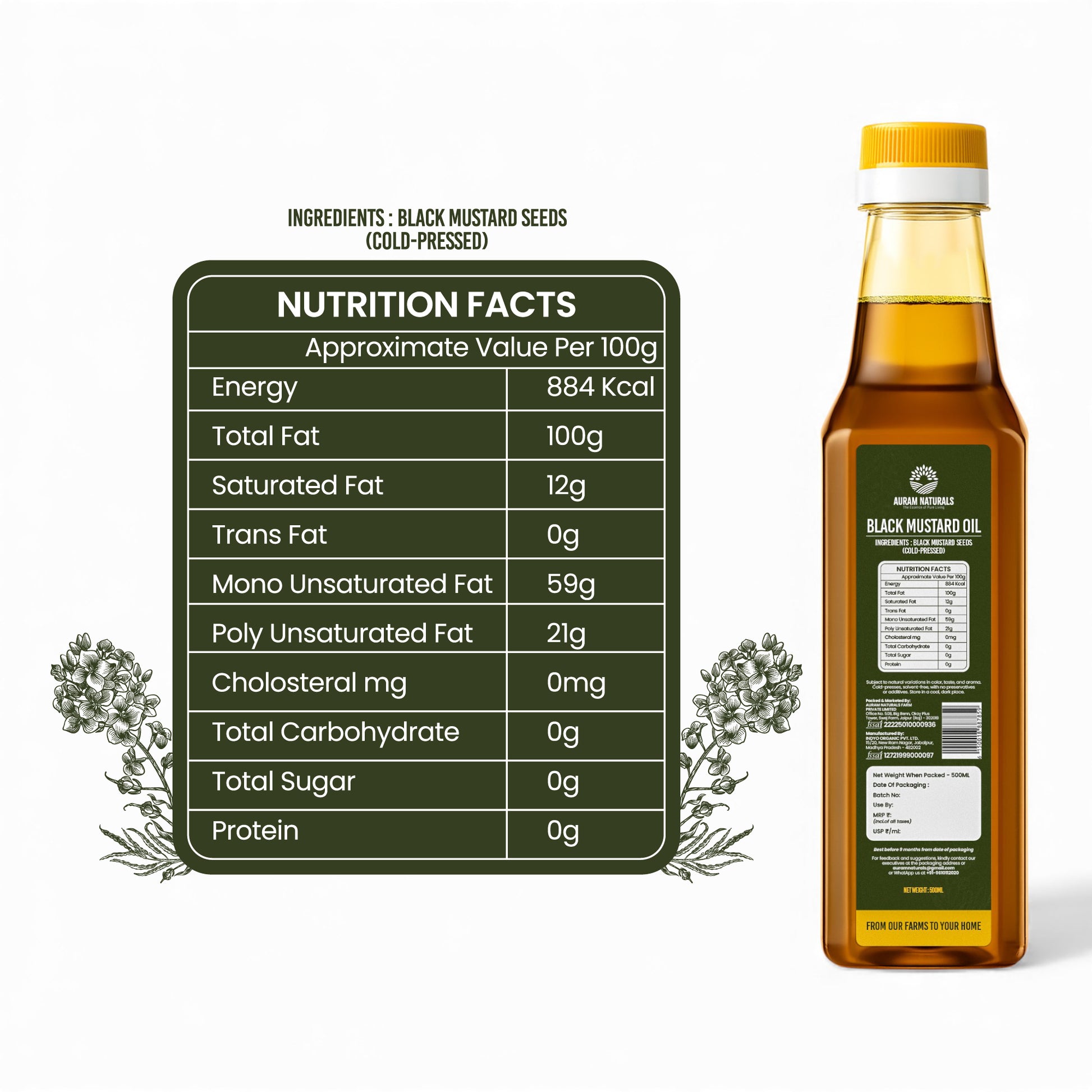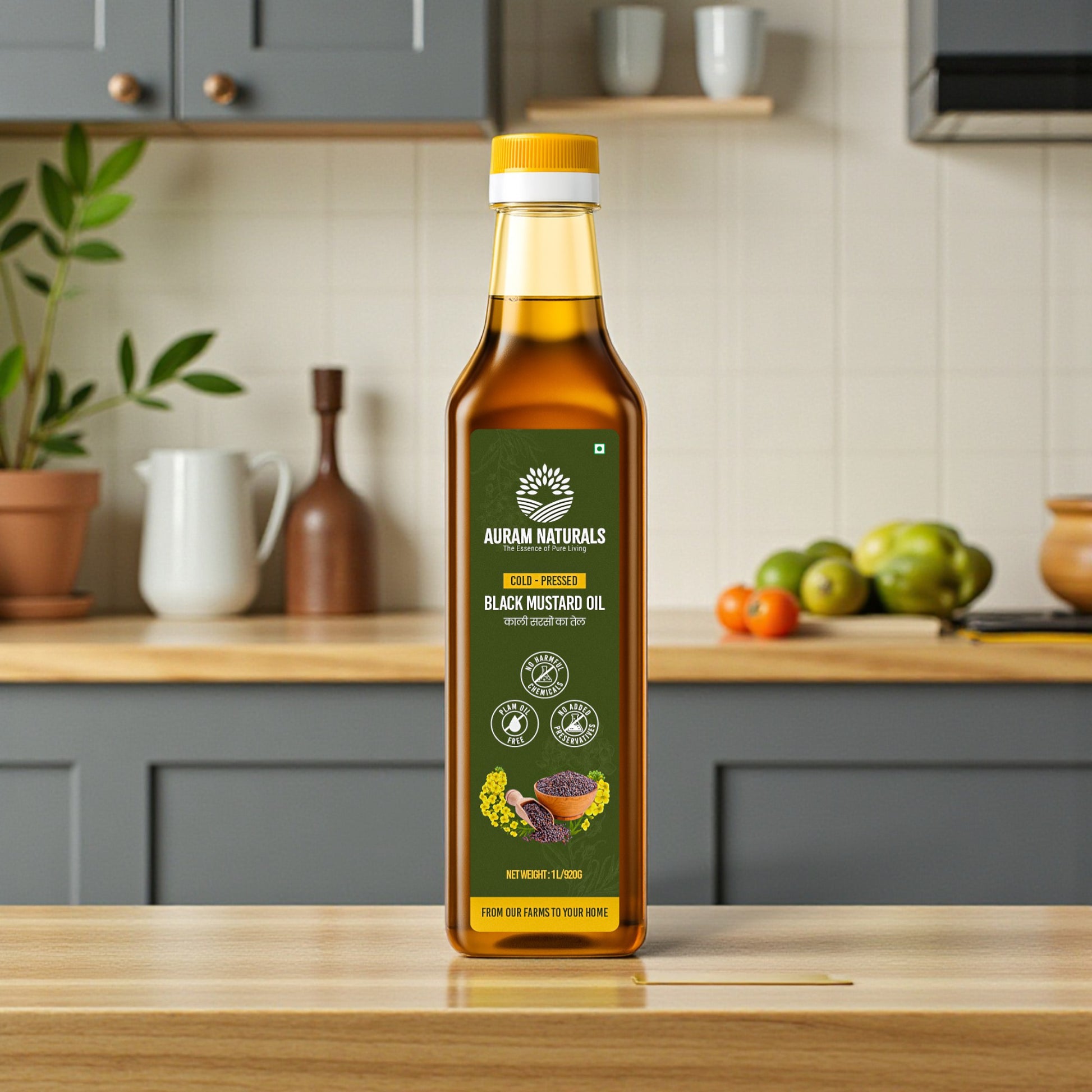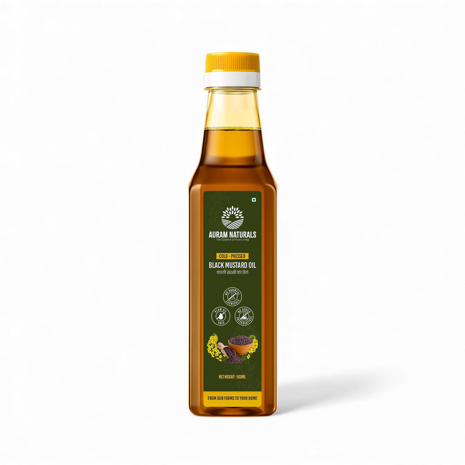 Auram Naturals Wood Pressed Black Mustard Oil is extracted using a traditional wooden churner (Lakdi Ghani), which preserves the natural nutrients, aroma, and authentic pungent flavor of pure mustard seeds. The slow, cold-pressed process ensures that the oil remains unrefined, chemical-free, and rich in antioxidants, making it a healthier choice for everyday cooking.